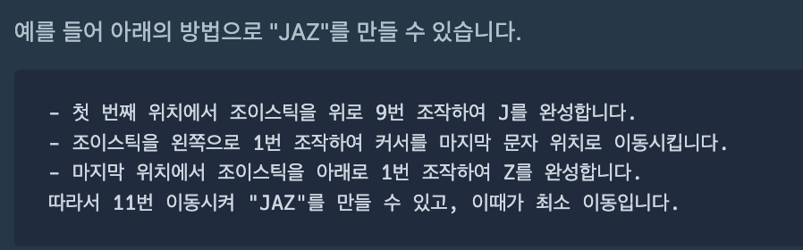위의 예시를 읽으면서 생각해보면 조이스틱을 위나 아래로 몇 번 조작해야 하는지는 구하기가 간단할 것 같다. A는 0, B는 1, C는 2, ... M은 12, N은 다시 12, O는 11 ... Z는 1번 조이스틱을 조작해서 만들 수 있다.